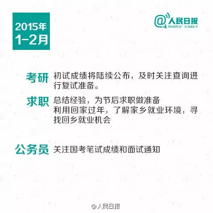 每年秋天,都是畢業(yè)生忙碌的開始。進(jìn)入十月,考研報(bào)名開始,目測(cè)一大波招聘會(huì)也將襲來,準(zhǔn)備好了嗎?2015屆畢業(yè)生就業(yè)月歷,有計(jì)劃地行動(dòng)起來!無論“就業(yè)黨”、“考研黨”還是“出國(guó)黨”,通統(tǒng)用得上!愿奮斗的秋天,會(huì)有最理想的收獲!超實(shí)用,速速收藏!