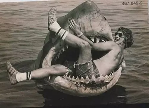 ▼《大白鯊》片場,斯皮爾伯格跟道具嬉戲。