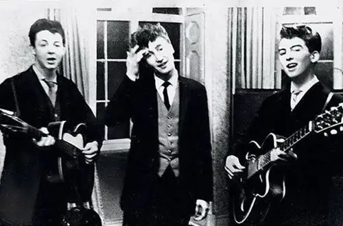 ▼1958年,尚未出名的麥卡特尼、列儂和哈里森(披頭士)在婚禮上表演