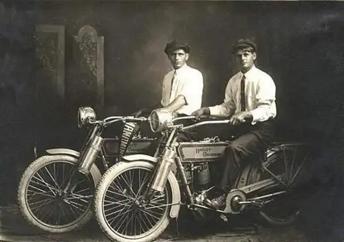 ▼1914年,威廉·哈雷和阿瑟·戴維森騎著他們生產(chǎn)的摩托。