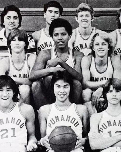 ▼跟高中籃球隊(duì)合影的少年奧巴馬